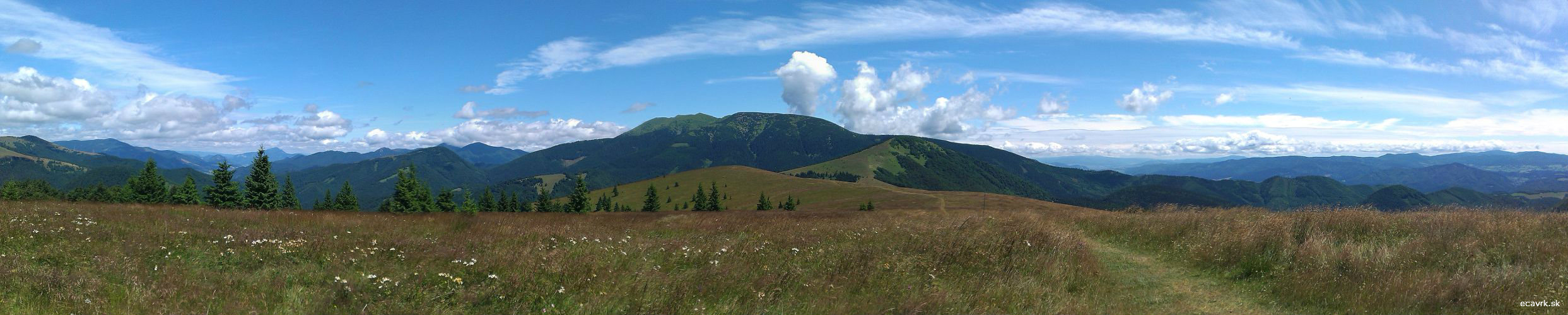 Sprava: Nová hoľa, Korytnická a Revúcka dolina, vzadu Choč a Ružomberok, v strede Prašivá a Nízke Tatry, vpravo Veporské vrchy a Poľana. V popredí Kozí chrbát.