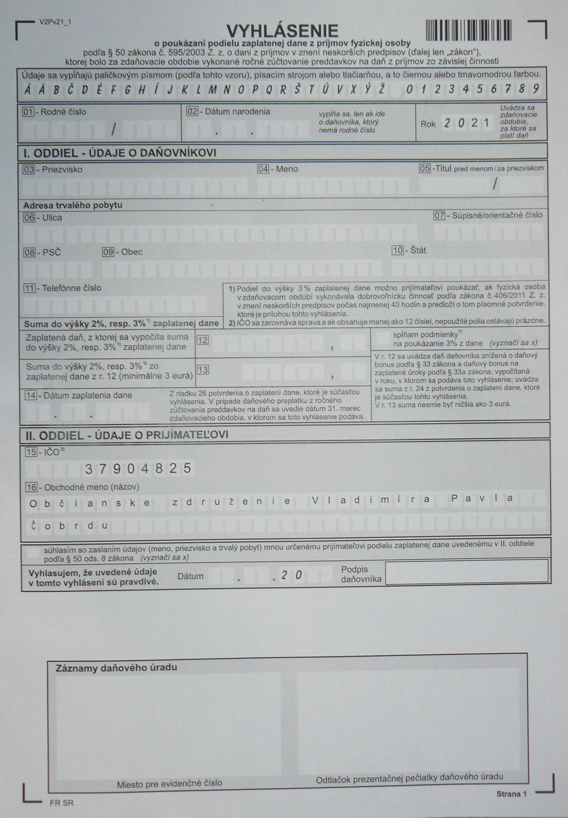 poukázaním 2% z vašich zaplatených dani pre Občianske združenie V. P.